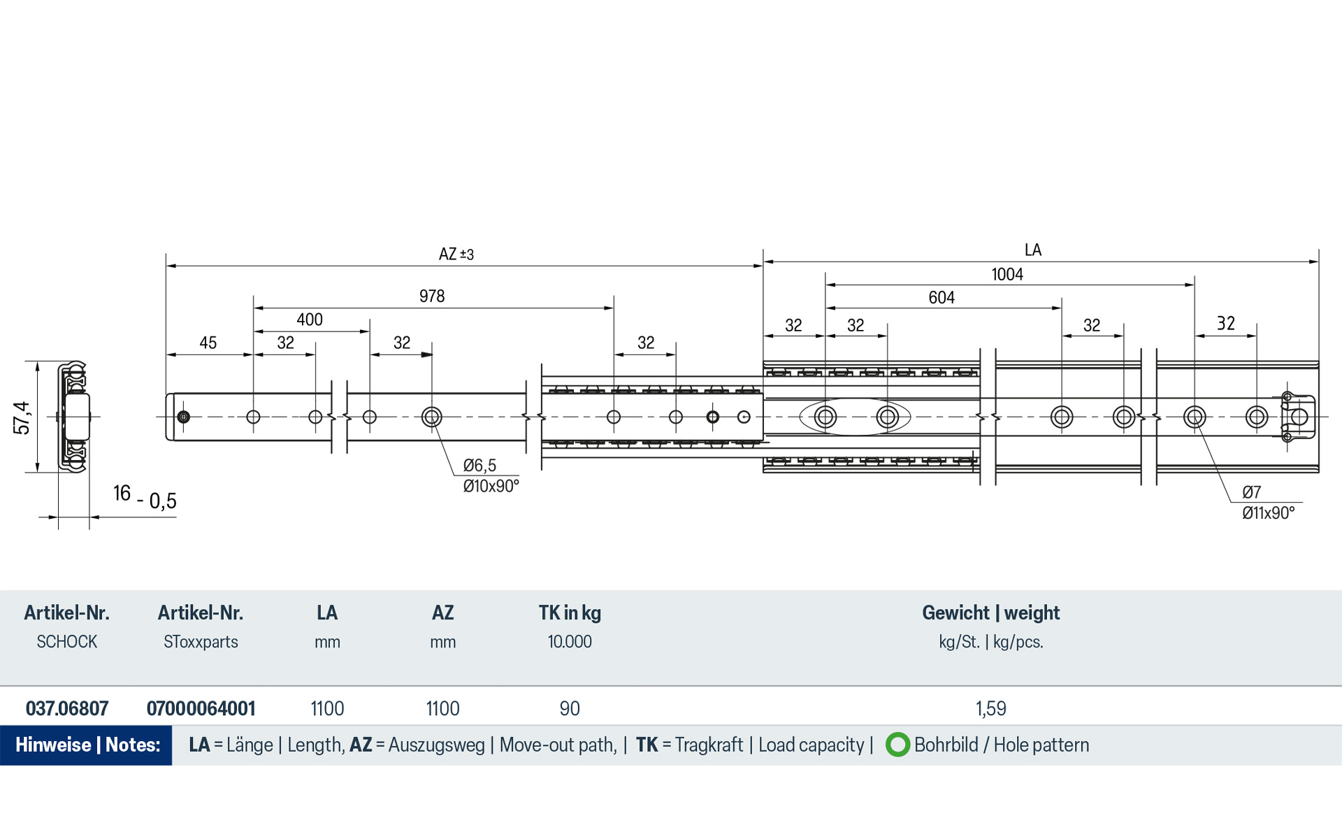 Telescopic slide full extension 037 | up to 90 kg | Hold-in | Schock telescopic slides