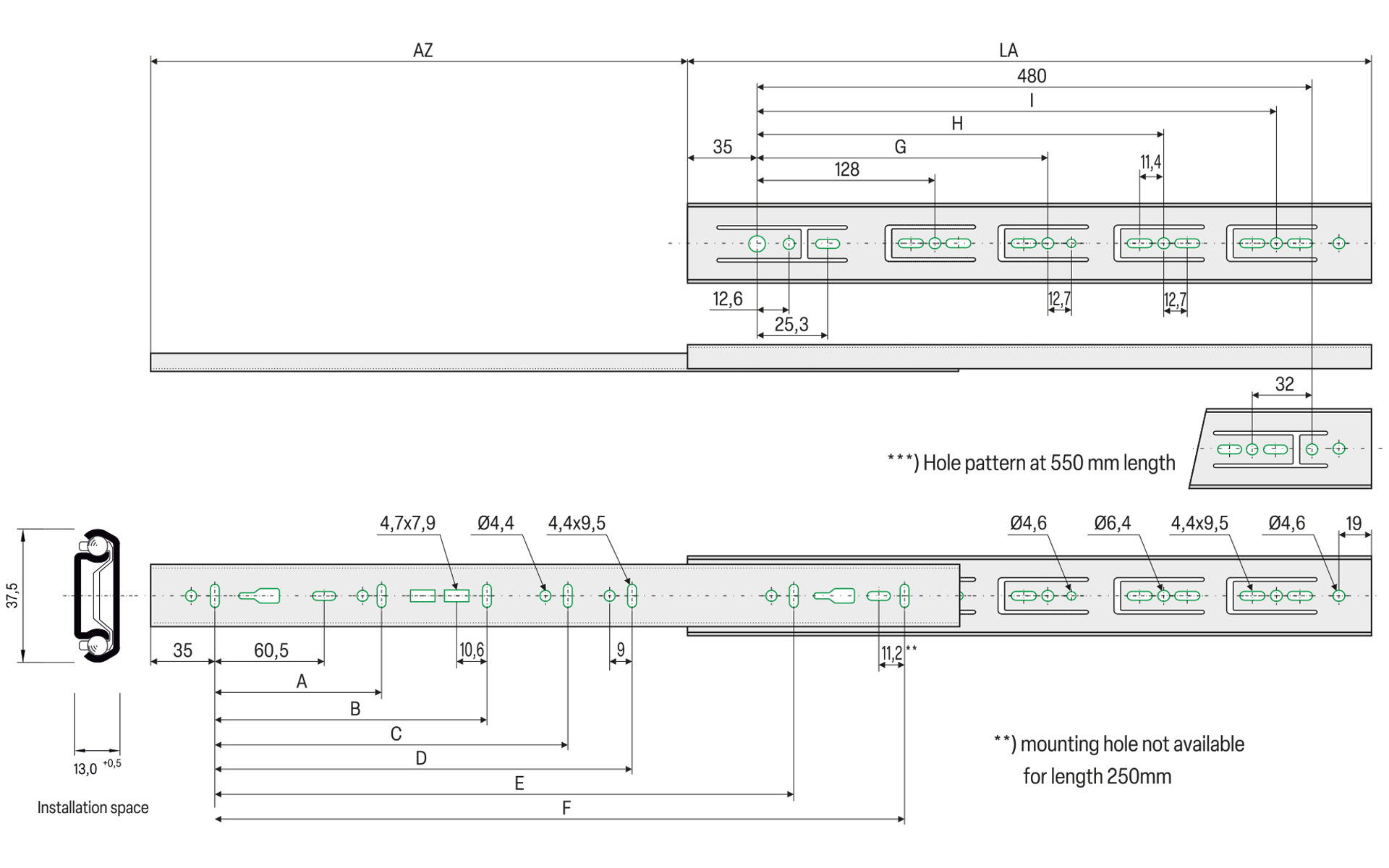 The specified load capacities are maximum values for a vertically mounted pair of telescopic slides with even load distribution when using all intended fixing positions.