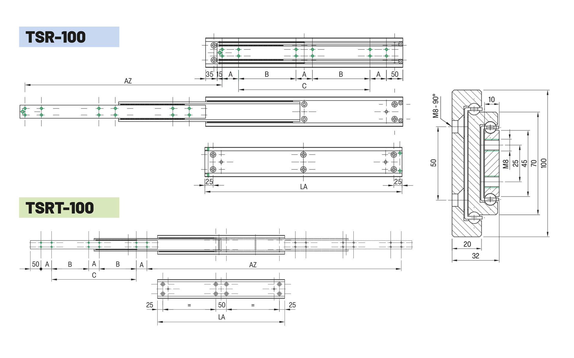 The general manufacturing tolerances of telescopic slides are in accordance with js13 standard for bores and linear dimensions. Straightness is 1 mm/m and twist is 1 degree/m.