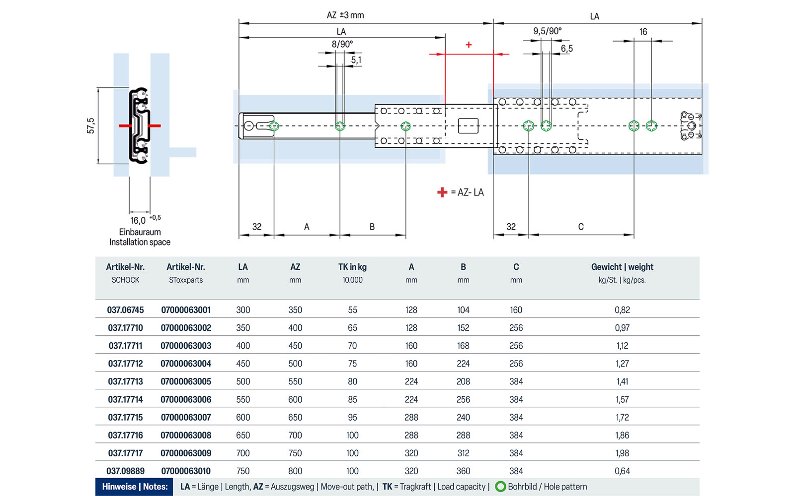 Notes: The locking device fixes the guide in closed position.The indicated load capacities are maximum values for a vertically mounted pair of telescopic slides with even load distribution when using all provided fixing positions.