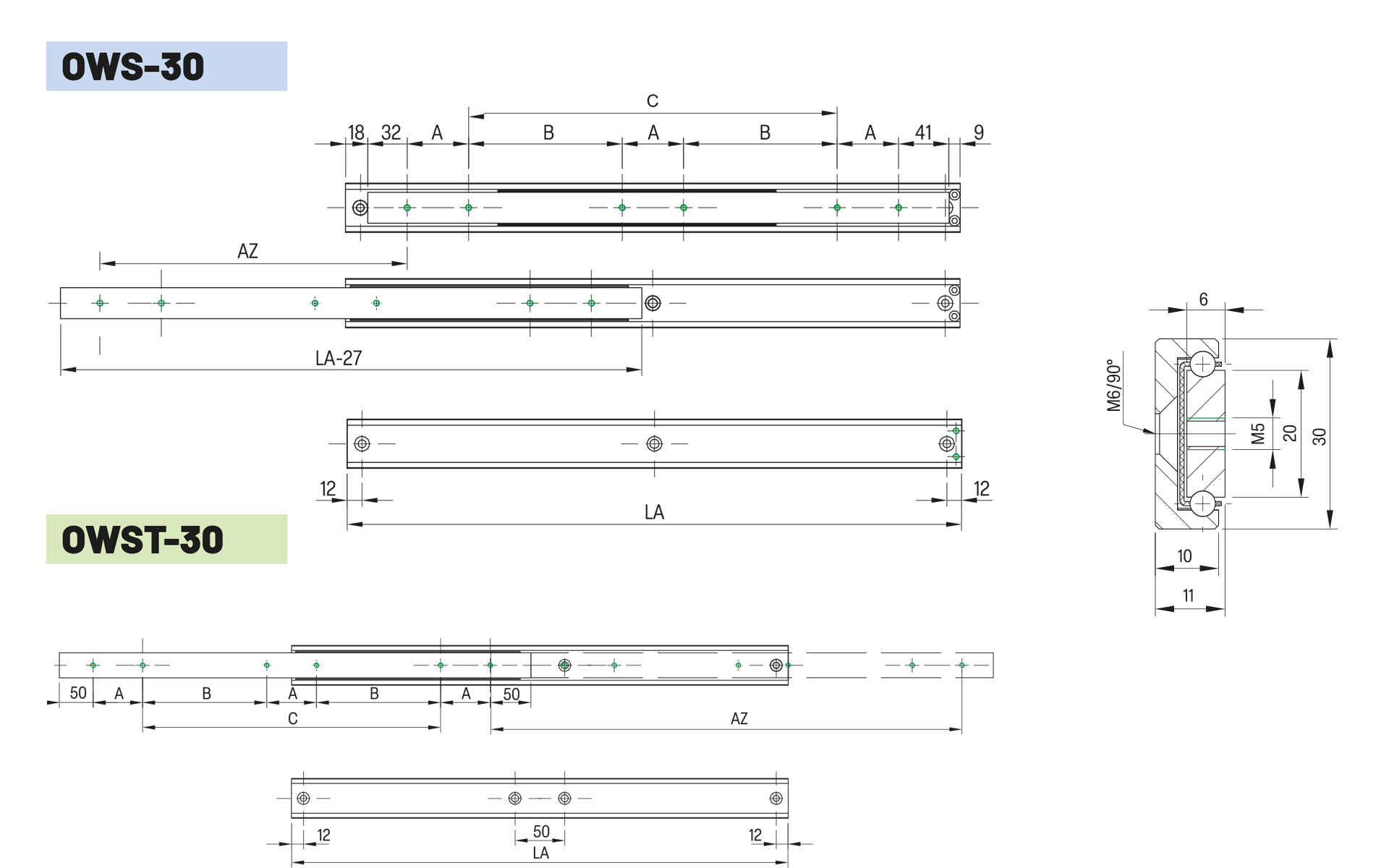 This is a 50% extension slide for heavy loads. Made from cold-drawn steel profiles and precision-milled ball bearing tracks, the OWS-30 telescopic slide offers good shock and vibration resistance when supporting a static load in the closed position. Accordingly, this slide is well-suited for installation on vehicles. The telescopic slide, made from solid steel profiles, offers a low overall height for its high load capacity. In the extended position, the slide is also very resistant to applied loads, making it an excellent choice for dynamic applications and manually operated systems.